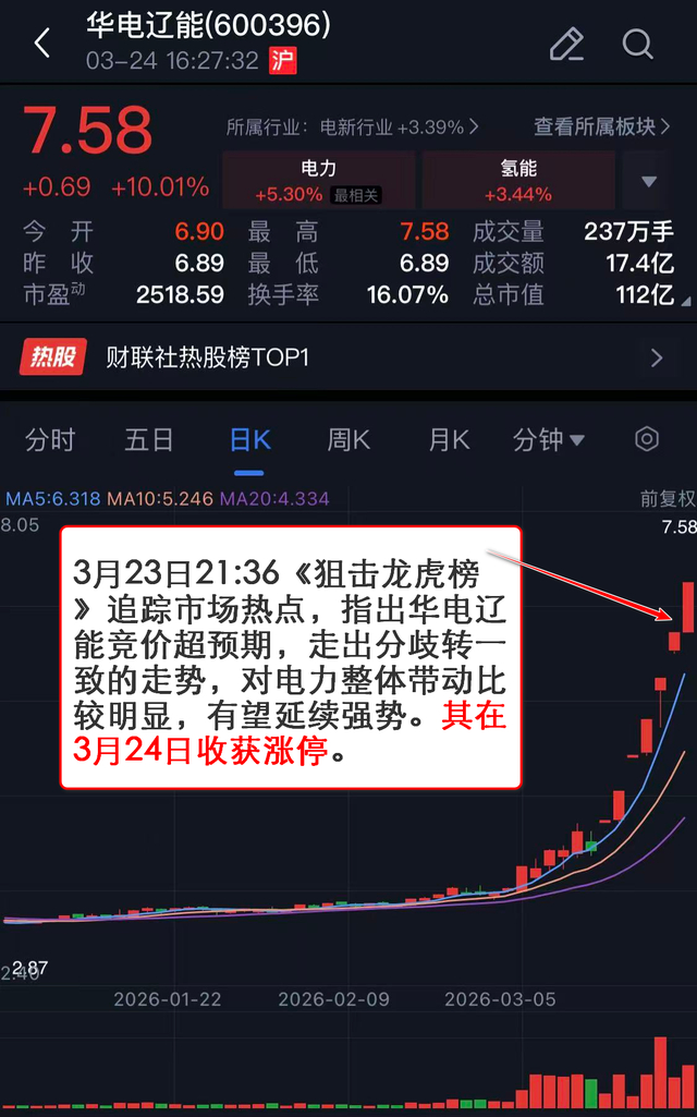 3月23日21:36《狙击龙虎榜》 追踪市场热点,指出华电辽能竞价超预期,走出分歧转一致的走势,对电力整体带动比较明显,有望延续强势。其在3月24日收获涨停。