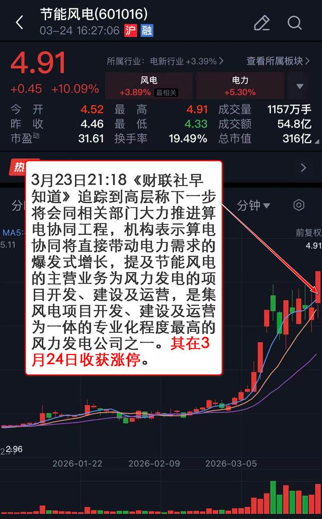3月23日21:18《财联社早知道》 追踪到高层称下一步将会同相关部门大力推进算电协同工程,机构表示算电协同将直接带动电力需求的爆发式增长,提及节能风电的主营业务为风力发电的项目开发、建设及运营,是集风电项目开发、建设及运营为一体的专业化程度最高的风力发电公司之一。其在3月24日收获涨停。