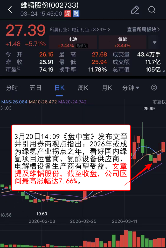 3月20日14:09《盘中宝》 发布文章并引用券商观点指出:2026年或成为绿氢产业拐点之年,看好国内绿氢项目运营商、氨醇设备供应商、电解槽设备生产商有望受益。文章提及雄韬股份,截至收盘,公司区间最高涨幅达7.66%。
