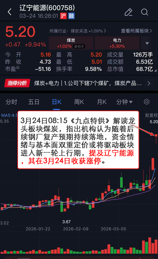 3月24日08:15《九点特供》 解读龙头板块煤炭,指出机构认为随着后续钢厂复产预期持续落地,资金情绪与基本面双重定价或将驱动板块进入新一轮上行期,提及辽宁能源,其在3月24日收获涨停。