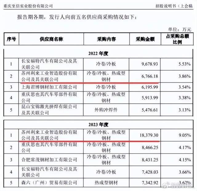 企查查数据揭示,主要供应商中的重庆武中汽车零部件有限公司与重庆丰岛科技发展有限公司存在明显关联:两家企业共用同一邮箱,且重庆武中监事刘多同时担任重庆丰岛监事并持股20%。但至信股份招股书未披露这一关联关系,将两家企业列为独立供应商。更值得警惕的是,重庆武中实为长安福特指定供应商,而至信股份未合并披露其与重庆丰岛的采购情况,引发市场对其刻意隐瞒客户指定供应商采购量、数据真实性质疑。