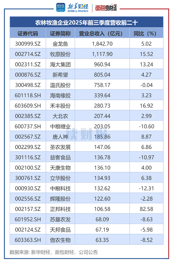 金龙鱼、牧原股份、海大集团在2025年前三季度分别实现收入1842.7亿元、1117.9亿元、960.94亿元,此外新希望、温氏股份的营收规模超过500亿元,相对靠前。增速方面,贤丰控股、新赛股份、邦基科技的营收增速超过100%,ST景谷、*ST天山、*ST佳沃等6家公司收入降幅超过30%。