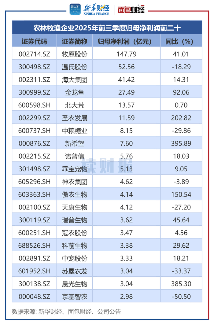 新华财经和面包财经研究员梳理公开资料显示,A股申万一级行业分类为农林牧渔的115家企业2025年前三季度合计实现营收9556.07亿元、归母净利润369.41亿元,同比分别增长5.73%、11.49%。