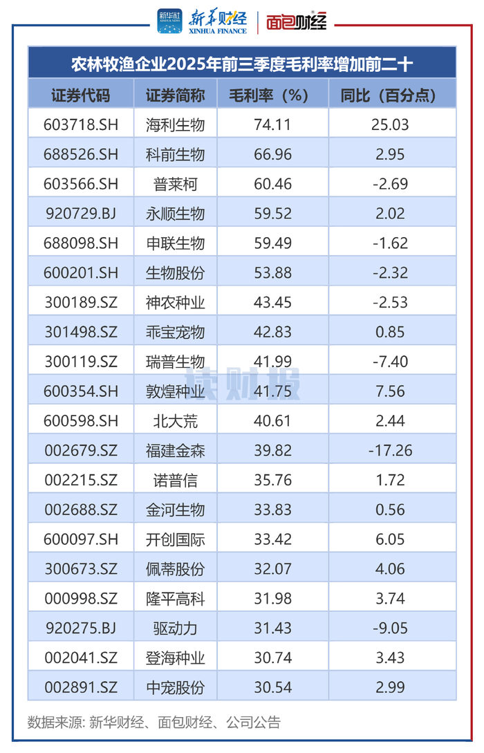 2025年前三季度,农林牧渔企业平均毛利率约17.92%,中位数为13.3%,同比均出现下降。其中,海利生物、科前生物、普莱柯毛利率超过60%。