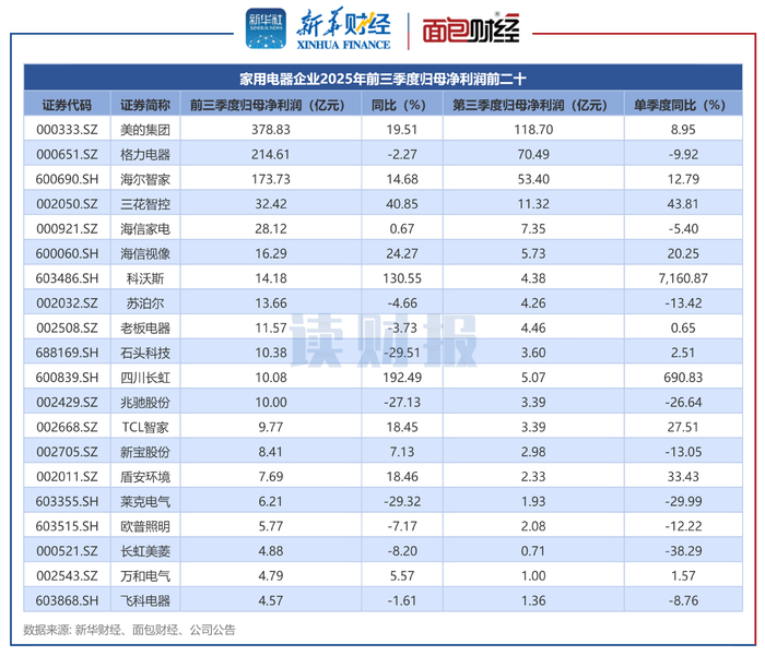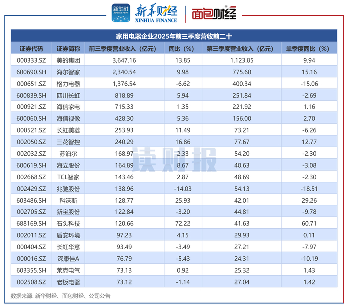 美的集团、海尔智家、格力电器在2025年前三季度分别实现收入3647.16亿元、2340.54亿元、1376.54亿元,此外四川长虹、海信家电的营收规模超过500亿元。增速方面,同洲电子的营收增速达176.75%,石头科技、三星新材收入增幅超过50%。