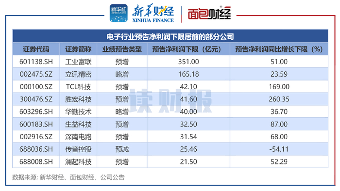 数据显示,工业富联、立讯精密、TCL科技的预告净利润规模下限位列前三。