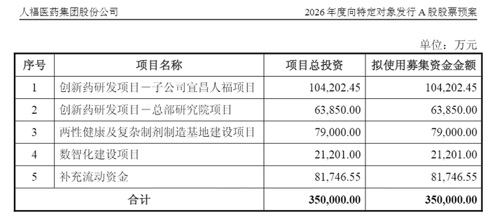 募集资金将全部用于公司主营业务相关的项目及补充流动资金。具体投向包括:创新药研发项目(包含子公司宜昌人福项目与总部研究院项目)、两性健康及复杂制剂制造基地建设项目、数智化建设项目。其中,创新药研发与制造基地建设是资金投入的主要方向。