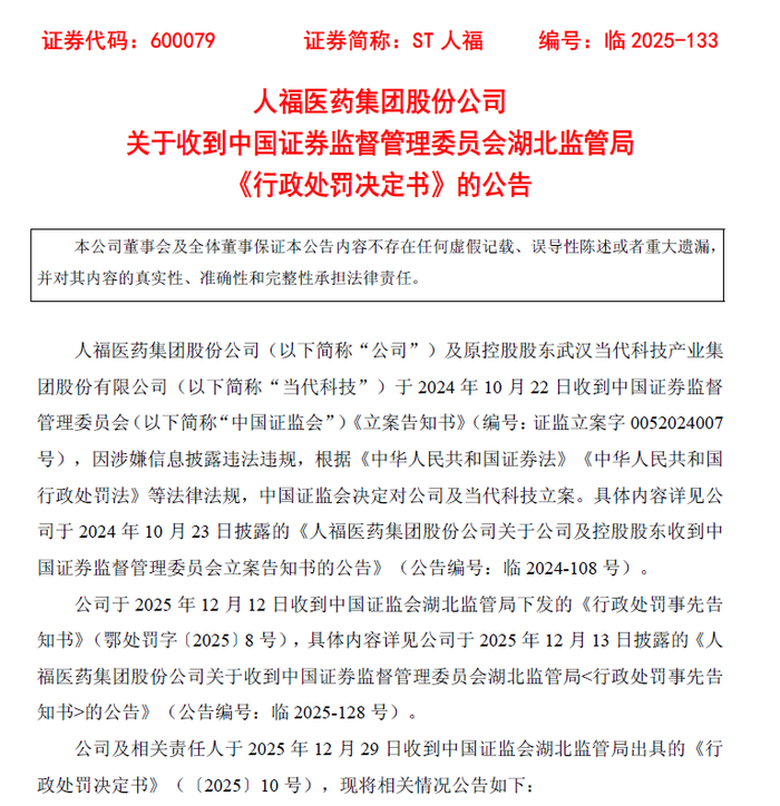 2025年12月29日,人福医药公告收到中国证券监督管理委员会湖北监管局《行政处罚决定书》。