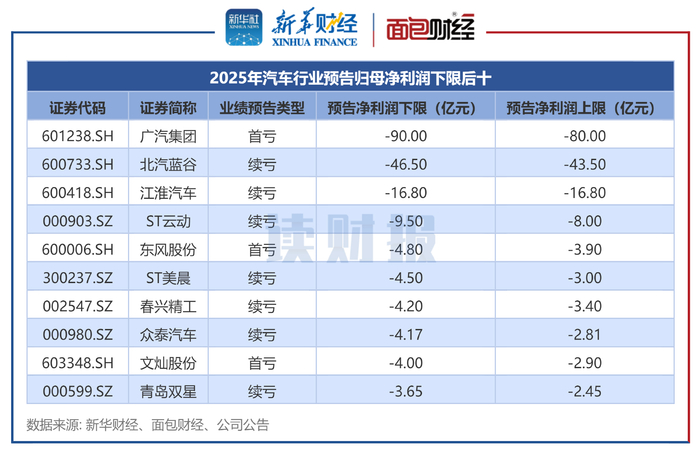 统计数据显示,申万一级分类为汽车行业的上市公司中,有50多家公司预告归母净利润下限为负,呈亏损状态。亏损前三位的公司分别是广汽集团、北汽蓝谷、江淮汽车,预计亏损规模均超过10亿元。