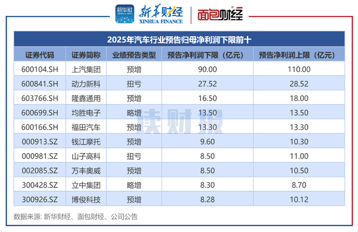 以预告归母净利润下限统计,14家公司预计归母净利润超过10亿元。其中,上汽集团的预告归母净利润下限为90亿元,位列第一;动力新科、隆鑫通用的预告归母净利润下限超过15亿元。