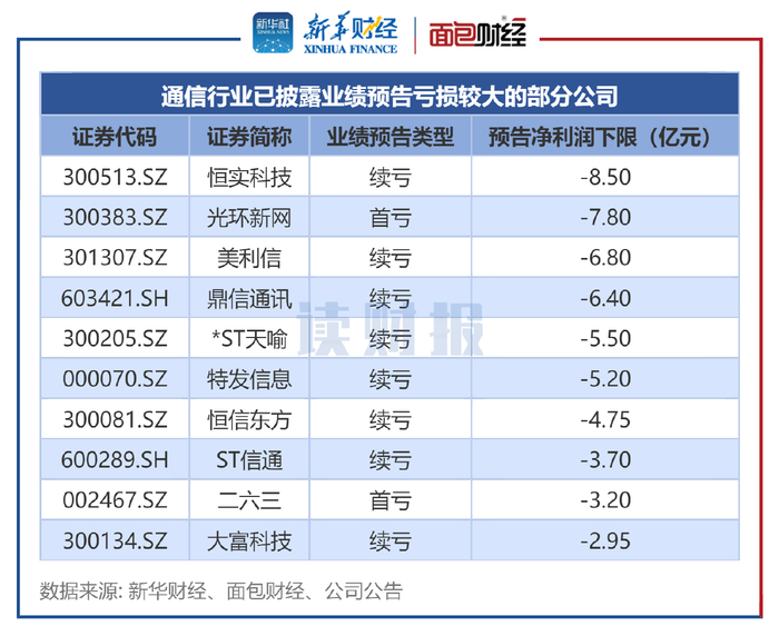 统计数据显示,通信行业已公布业绩预告的公司中,预告净利润下限亏损排名前三位的公司分别是恒实科技、光环新网及美利信。
