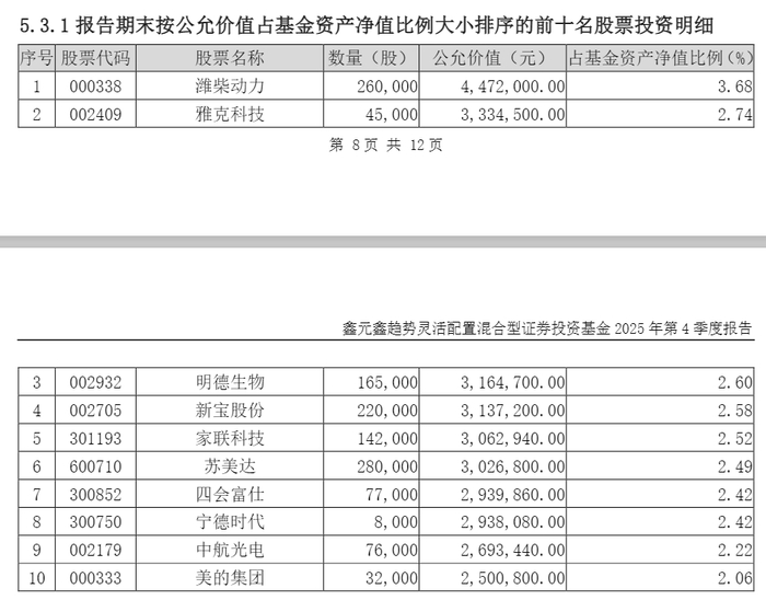 从2025年四季度末持仓来看,该基金行业配置分散,持股集中度较低。2026年以来,其重仓股如潍柴动力、雅克科技等表现突出,或为基金净值增长做出了重要贡献。