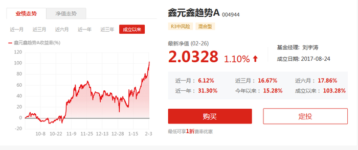 Wind数据显示,截至2026年2月26日,鑫元鑫趋势A成立8年多净值累计上涨103.28%,跑赢业绩比较基准超过60个百分点;过去1年净值上涨31.3%,跑赢业绩基准超过20个百分点。