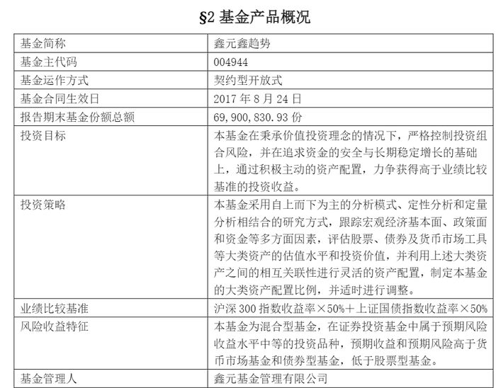 公开资料显示,鑫元鑫趋势的业绩比较基准为:沪深300指数收益率×50%+上证国债指数收益率×50%。基金的投资目标为:在秉承价值投资理念的情况下,严格控制投资组合风险,并在追求资金的安全与长期稳定增长的基础上,通过积极主动的资产配置,力争获得高于业绩比较基准的投资收益。