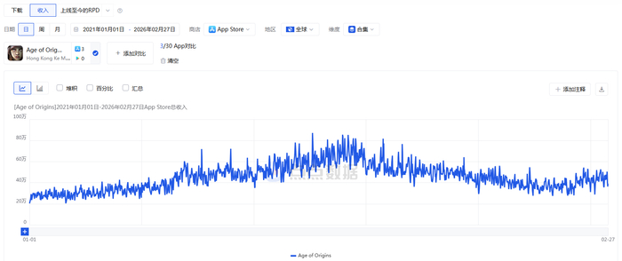 根据全球移动应用、游戏数据监测服务商点点数据的监测,《Age of Origins》来自全球iOS平台的收入自2024年以来呈下滑趋势,但2025年下半年以来企稳反弹。
