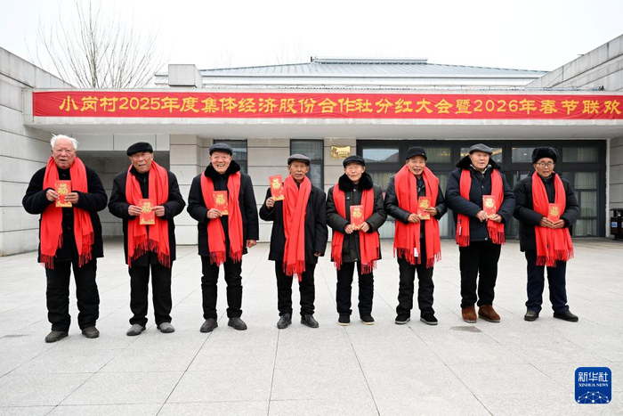2026年2月10日,在安徽省凤阳县小岗村,“大包干”带头人展示自家领取的分红红包。2月10日,“中国农村改革第一村”小岗村举行2025年度集体经济股份合作社分红大会,每位集体经济组织成员分红730元,村民喜提2025年度分红红包。从2017年度每人350元到2025年度每人730元,小岗村连续九年分红,金额实现八连增。