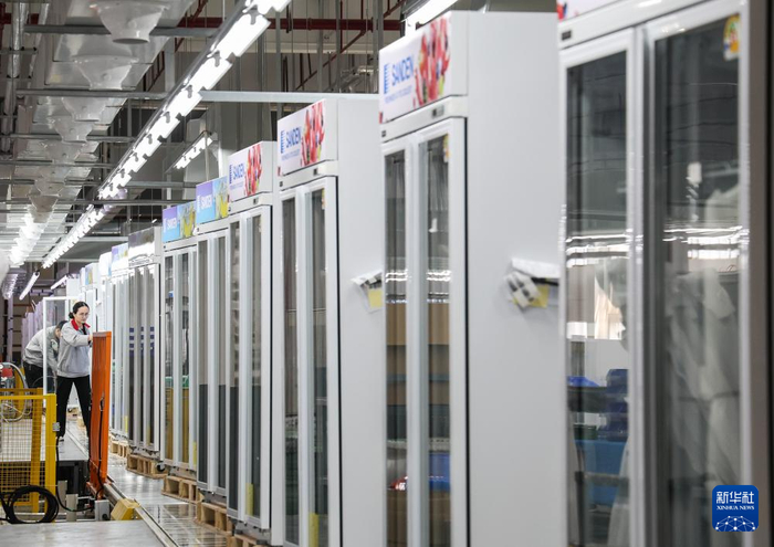 这是在西科冷链广东江门制造基地的产线上,工人对一批出口海外的商用冷柜进行外观检查(2025年3月22日摄)。