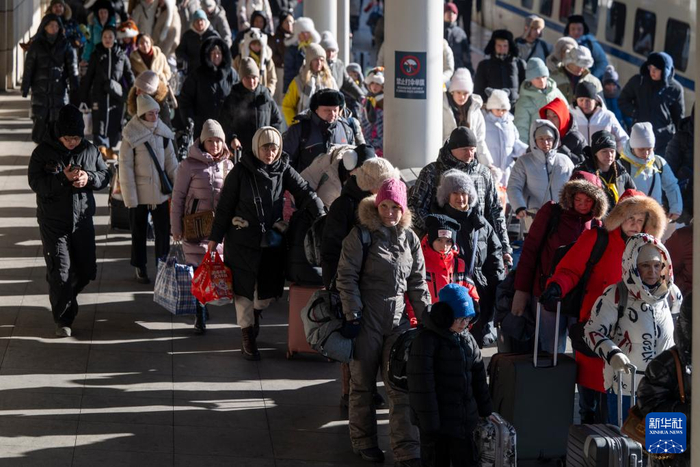 2026年1月8日,在绥芬河火车站,游客下车出站。黑龙江省绥芬河市是中俄重要陆路口岸城市。随着中俄双向免签政策实施,当地以高效便捷的通关服务提升口岸人员和贸易往来效率,带动两国人文和旅游交流。