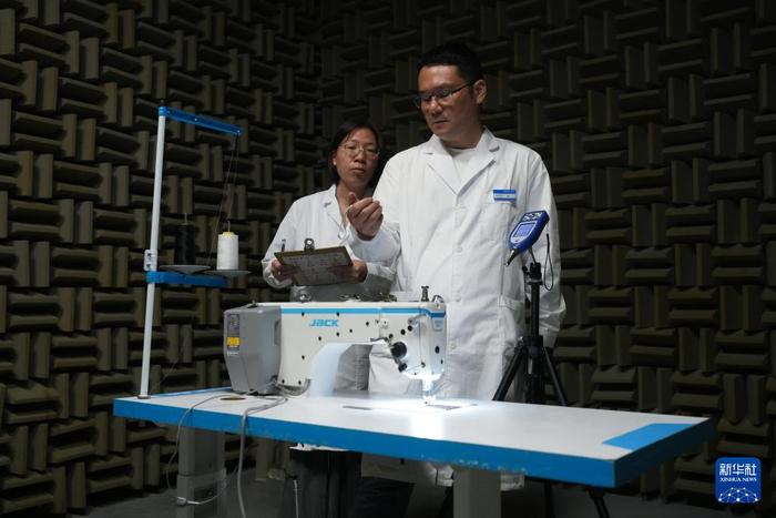 在位于台州的杰克科技股份有限公司总部,实验室工程师在半消音室检测智能缝纫机噪声(2025年7月17日摄)。位于浙江台州的杰克科技股份有限公司是一个从家用缝制设备起家的民营企业,通过不断的科技创新、专利积累、国际化并购等,成为全球智能化服装装备行业的领军者。