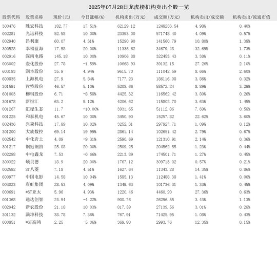 2025年07月28日盘后龙虎榜公开信息中,有60支股票出现了机构的身影。其中,有33支股票出现了机构买入,27支股票出现了机构卖出。