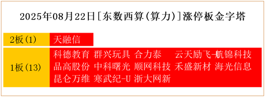一共有19支个股涨停。其中,天融信2板;科德教育、佳都科技、群兴玩具、云天励飞-U、三川智慧、航锦科技、品高股份、中科曙光、顺网科技、旭光电子、华东重机、禾盛新材、和而泰、海光信息、昆仑万维、税友股份、塞力医疗、浙大网新1板。