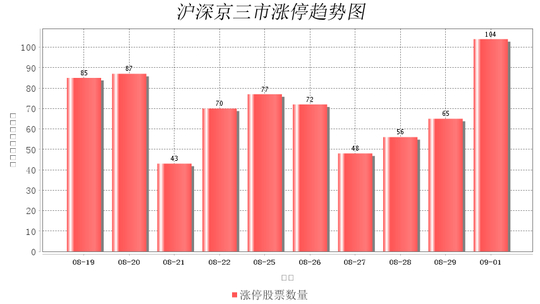 今日沪深京三市一共104支股票涨停,较上一个交易的65支增加39支。