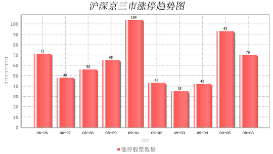 今日沪深京三市一共70支股票涨停,较上一个交易的93支减少23支。