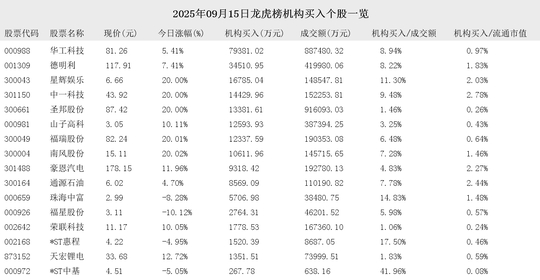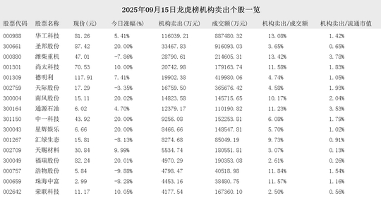 2025年09月15日盘后龙虎榜公开信息中,有38支股票出现了机构的身影。其中,有16支股票出现了机构买入,22支股票出现了机构卖出。