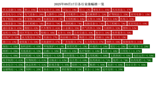 今日涨幅居前的行业有:多元金融(3.08%)、铜(2.65%)、光学光电子(2.36%)、空运(2.24%)、铝(2.12%)、摩托车(1.65%)、机床制造(1.47%)、新型电力(1.37%)、电气设备(1.26%)、元器件(1.24%)。