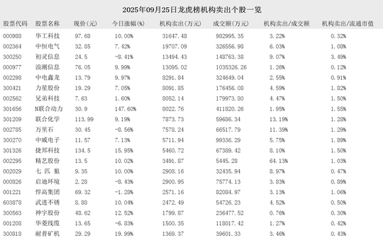2025年09月25日盘后龙虎榜公开信息中,有46支股票出现了机构的身影。其中,有20支股票出现了机构买入,26支股票出现了机构卖出。
