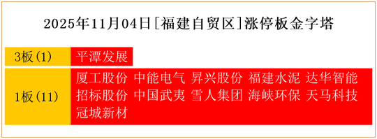 一共有12支个股涨停。其中,平潭发展3板;厦工股份、中能电气、昇兴股份、福建水泥、达华智能、招标股份、中国武夷、雪人集团、海峡环保、天马科技、冠城新材1板。