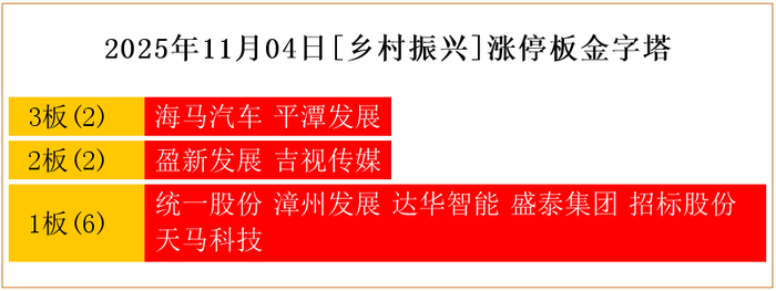 一共有10支个股涨停。其中,海马汽车、平潭发展3板;盈新发展、吉视传媒2板;统一股份、漳州发展、达华智能、盛泰集团、招标股份、天马科技1板。