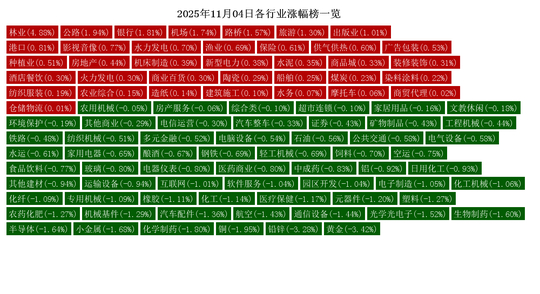 今日涨幅居前的行业有:林业(4.88%)、公路(1.94%)、银行(1.81%)、机场(1.74%)、路桥(1.57%)、旅游(1.3%)、出版业(1.01%)、港口(0.81%)、影视音像(0.77%)、水力发电(0.7%)。