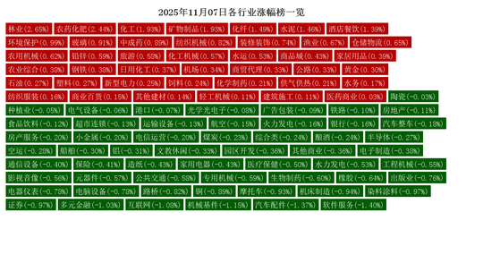 今日涨幅居前的行业有:林业(2.65%)、农药化肥(2.44%)、化工(1.93%)、矿物制品(1.93%)、化纤(1.49%)、水泥(1.46%)、酒店餐饮(1.39%)、环境保护(0.99%)、玻璃(0.91%)、中成药(0.89%)。