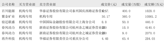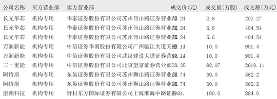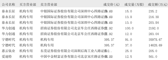 今日大宗交易榜单中出现机构买入席位的个股为:华兰生物、章源钨业、荣盛石化、东诚药业、浙农股份、泰永长征、华力创通、宁德时代、惠云钛业、爱迪特、百川能源、紫金矿业、宿迁联盛、春风动力、再升科技、长光华芯、万润新能、三一重能、阿特斯、康鹏科技、宏远股份。