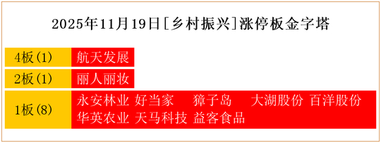 一共有10支个股涨停。其中,航天发展4板;丽人丽妆2板;永安林业、好当家、獐子岛、大湖股份、百洋股份、华英农业、天马科技、益客食品1板。