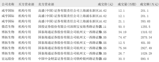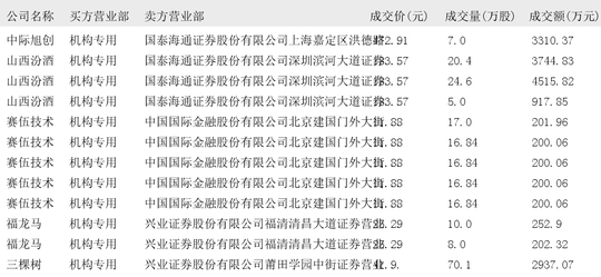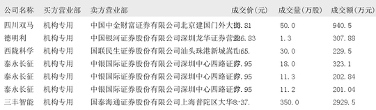今日大宗交易榜单中出现机构买入席位的个股为:四川双马、德明利、西陇科学、泰永长征、三丰智能、中际旭创、山西汾酒、赛伍技术、福龙马、三棵树、咸亨国际、微芯生物、博拓生物、宏远股份。