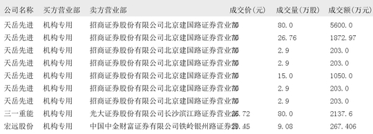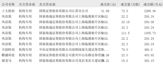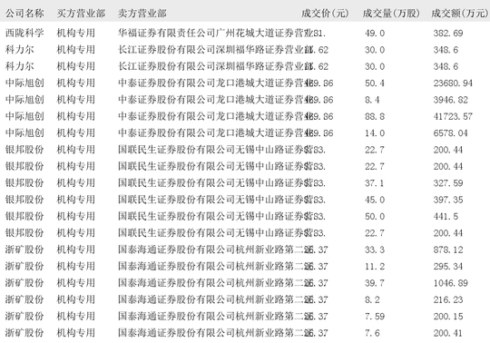 今日大宗交易榜单中出现机构买入席位的个股为:西陇科学、科力尔、中际旭创、银邦股份、浙矿股份、上大股份、风语筑、天创时尚、麒盛科技、福龙马、天岳先进、三一重能、宏远股份。