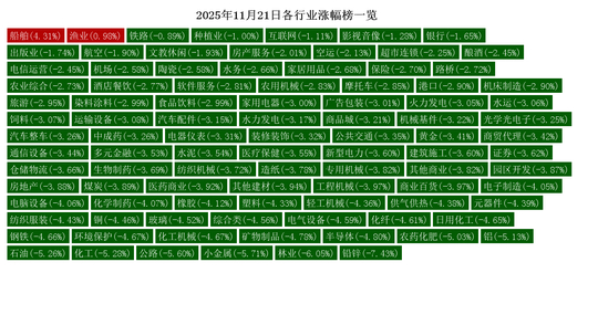 今日跌幅居前的行业有:铅锌(-7.43%)、林业(-6.05%)、小金属(-5.71%)、公路(-5.6%)、化工(-5.28%)、石油(-5.26%)、铝(-5.13%)、农药化肥(-5.03%)、半导体(-4.8%)、矿物制品(-4.78%)。
