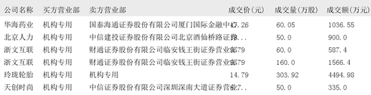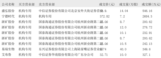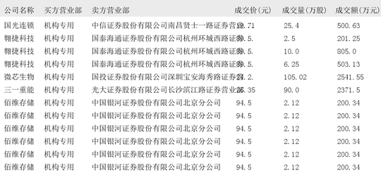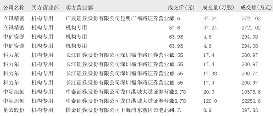 今日大宗交易榜单中出现机构买入席位的个股为:立讯精密、中矿资源、科力尔、中际旭创、星云股份、盛弘股份、宁德时代、浙矿股份、易瑞生物、艾布鲁、华海药业、北京人力、浙文互联、玲珑轮胎、天创时尚、国光连锁、翱捷科技、微芯生物、三一重能、佰维存储、惠泰医疗。