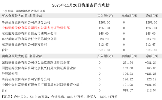 买入前5席为:华源证券股份有限公司深圳分公司、中信证券股份有限公司西安朱雀大街证券营业部、东亚前海证券有限责任公司四川分公司、东亚前海证券有限责任公司苏州分公司、东方证券股份有限公司东方资财。共计买入:5119.01万元,共计卖出:0万元。