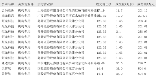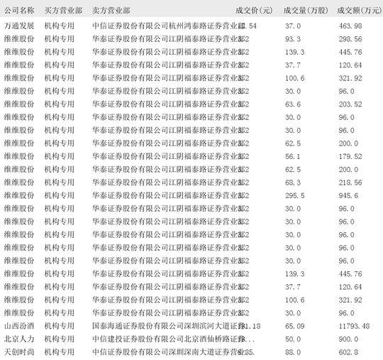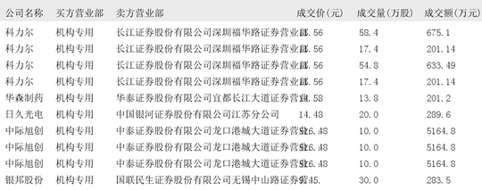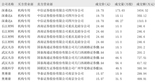 今日大宗交易榜单中出现机构买入席位的个股为:深桑达A、长江材料、武汉凡谷、西陇科学、奥赛康、科力尔、华森制药、日久光电、中际旭创、银邦股份、胜宏科技、澄天伟业、佳禾智能、盟固利、固高科技、万通发展、维维股份、山西汾酒、北京人力、天创时尚、合兴股份、海光信息、炬光科技、隆达股份、天智航、国博电子、宏远股份。