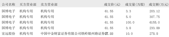 国博电子今日机构专用买入席位为4席,成交量共112.10万股,成交额共6899.76万元,成交额占流通市值比例为907.72%。