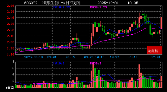 截止收盘,和邦生物报收2.41元/股,涨幅10.05%,成交量347万手,成交额8.25亿元,换手率3.93%。今日1板。