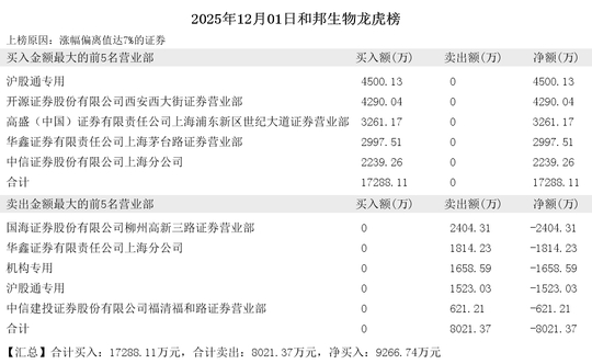 买入前5席为:沪股通专用、开源证券股份有限公司西安西大街证券营业部、高盛(中国)证券有限责任公司上海浦东新区世纪大道证券营业部、华鑫证券有限责任公司上海茅台路证券营业部、中信证券股份有限公司上海分公司。共计买入:17288.11万元,共计卖出:0万元。