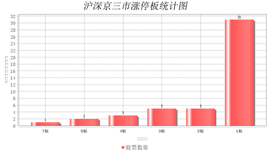 7板共1支,5板共2支,4板共3支,3板共5支,2板共5支,1板共31支,市场当前最高板为7连板!