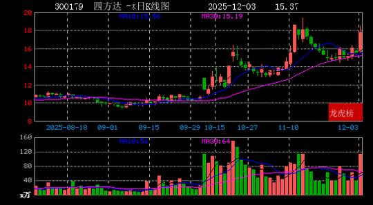 截止收盘,四方达报收17.79元/股,涨幅15.37%,成交量114万手,成交额19.98亿元,换手率30.53%。今日未涨停。