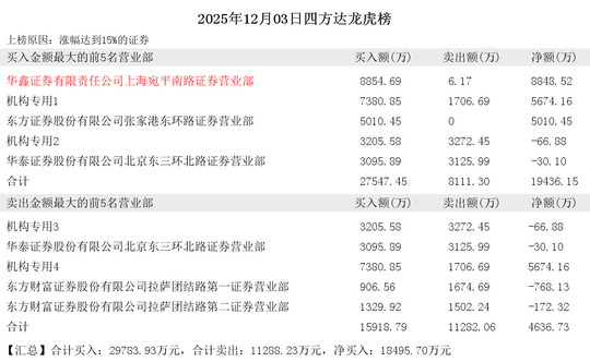 卖出前5席为:机构专用3、华泰证券股份有限公司北京东三环北路证券营业部、机构专用4、东方财富证券股份有限公司拉萨团结路第一证券营业部、东方财富证券股份有限公司拉萨团结路第二证券营业部。共计买入:15918.79万元,共计卖出:11282.06万元。