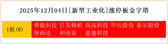 一共有8支个股涨停。其中,睿能科技、日发精机、固高科技、华伍股份、泰尔股份、恒而达、和而泰、盈趣科技1板。