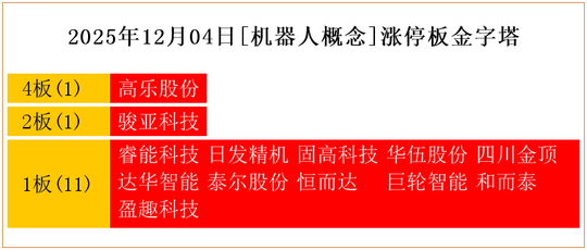 一共有13支个股涨停。其中,高乐股份4板;骏亚科技2板;睿能科技、日发精机、固高科技、华伍股份、四川金顶、达华智能、泰尔股份、恒而达、巨轮智能、和而泰、盈趣科技1板。